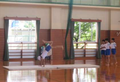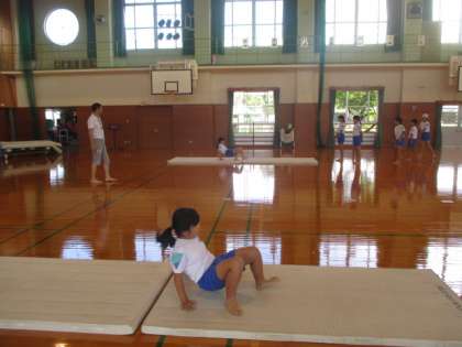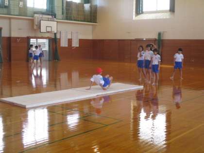 マット運動では、技の基本となる動きを確認しながら練習しています。