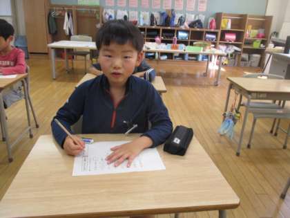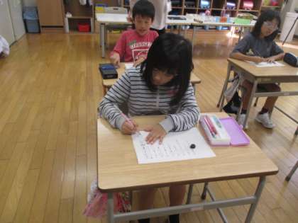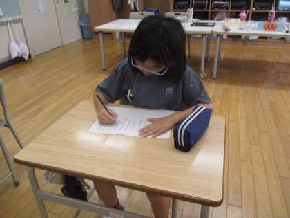 正しい姿勢と鉛筆の持ち方を意識して、丁寧に文字を書いています。