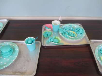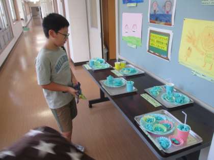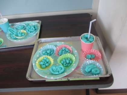 1年生の廊下には、粘土で作ったごちそうが並んでいます。