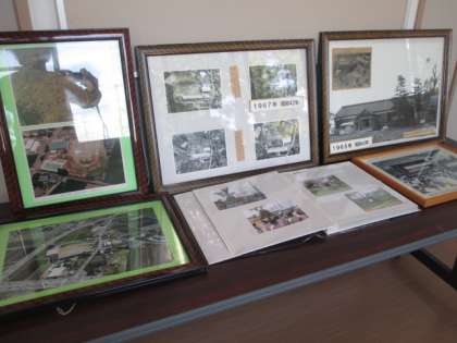 150周年式典に向けて、会議室の前に旧校舎や柳の木の写真を展示しています。
