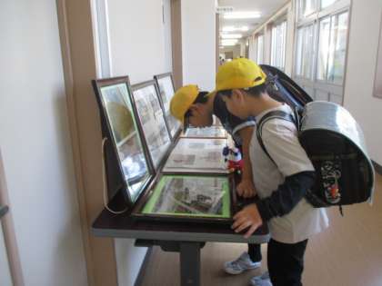 登校後の子供たちが、「柳の木って風で倒れたんだね」「こんな校舎だったんだ」と写真に見入っていました。