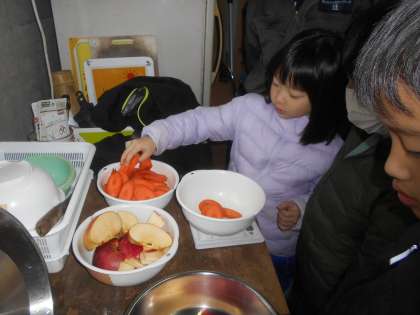 レッサーパンダチームは、レッサーパンダのために力を合わせて大きな笹の枝を運んだり、リンゴやにんじんなどのエサをはかりで量ったりしました。自分たちより小さなレッサーパンダが大量のエサを食べること、エサになる笹が生えている場所が限られていて、飼育員さんは毎日わざわざ遠くから笹を切って運んでいることなど、たくさんの驚きと発見がありました。