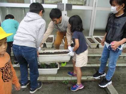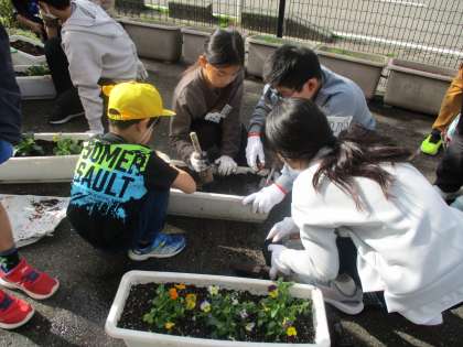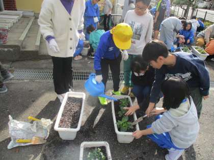 苗を植え、球根を埋めたら水をやり、プランターを移動しました。最後にファミリーのみんなで水やり当番を決めました。春になり、花いっぱいの学校になるのが楽しみです。