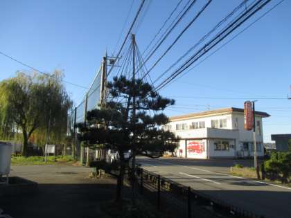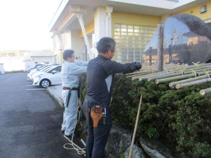 正面玄関横の石碑の周りの木々の雪釣り作業が進んでいます。