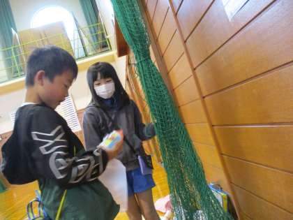 子供たちは、自分たちが作ったおもちゃの遊び方を説明し、1年生と楽しく遊びました。「わりばしをゴールに向けたらいいよ」「輪ゴムは自分の方に向かって巻いてね」などのアドバイスをしたり「おしい!」「すごい!」などと温かい声をかけたり姿が見られました。