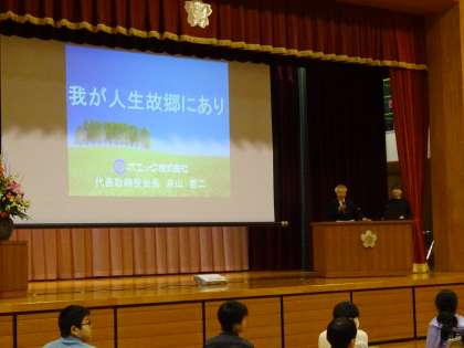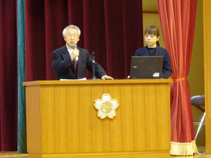 本校OBであり、ポエック株式会社会長の来山哲二氏に「我が人生故郷にあり」という演題でご講演いただきました。スライドで様々な画像を映しながら、小さい頃のエピソードや故郷や古沢小学校の思い出、現在の会社のことや会社を発展させるまでの様子、大切にしている言葉等、大変幅広くお話をいただきました。
