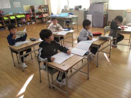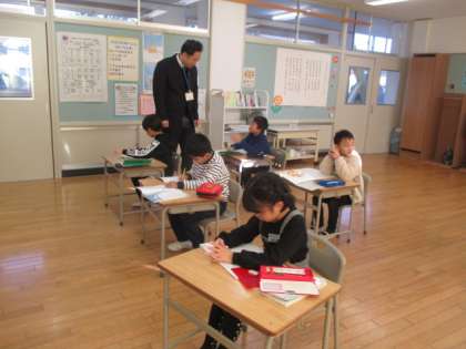 1年生は、片仮名を学習しています。小さく書く「ヤ」「ユ」「ヨ」「ツ」がついている言葉を見付けています。