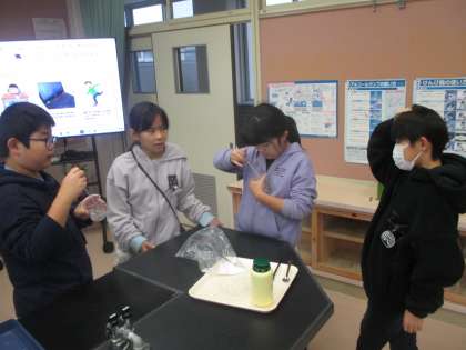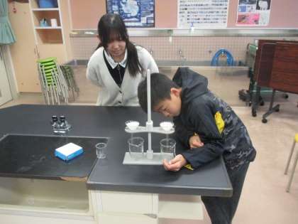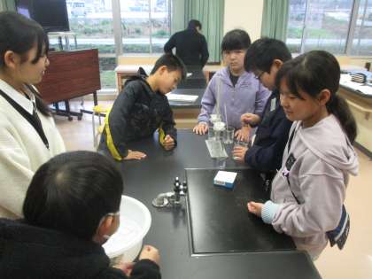 今日は水にとけた物を取り出す実験をしました。水溶液を冷やしたり、蒸発させたりして溶けている物を取り出しました。自分たちの予想と比べながら、安全に気をつけ、みんなで協力して実験に取り組みました。