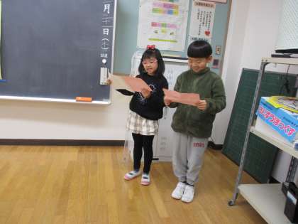 12月21日(木)2年生 クリスマス会をしたよ☆ 公開日 2023/12/21 更新日 2023/12/21 2年 今日は子供たちが楽しみにしていたクリスマス会♪自分の係の活動を、時間を見つけて頑張ってきました。どのプログラムも、子供たちの工夫がたくさんの素敵なものでした♪ 写真は、司会、始めの言葉、終わりの言葉担当の子供たちの様子です☆始めの言葉、終わりの言葉は、身振りもつけて言っていました☆