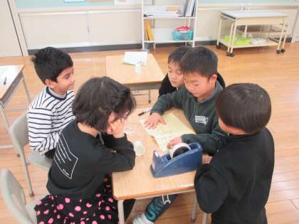 算数科「おおきなかず」の学習で、最初に一人一人が、つまようじをできるだけ多くつかみ、自分がつかんだつまようじが何本あるかが一目で分かる並べ方を考え、紹介し合いました。そして、感想を伝え合いました。これから位取りについて学んでいきます。