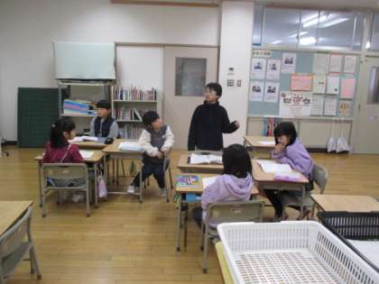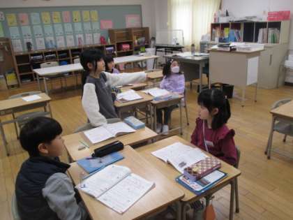 数直線上に表された大きな数の数え方について、真剣に話し合っています。友達の話をよく聞いて考えています。