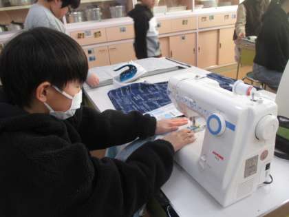 5年生は、クッションカバーを製作中。ミシンやアイロンがけにトライ!。