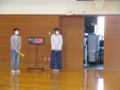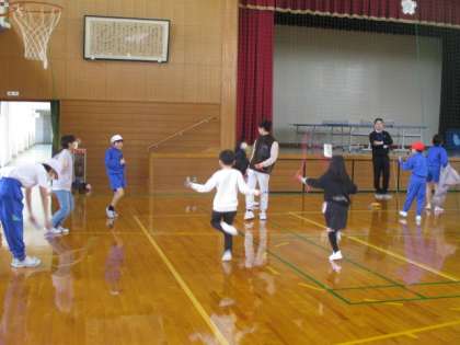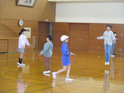 体育館でファミリー班に分かれて縄跳びの練習をしています。その後、低・中・高別にチャレンジする種目の回数を数えました。