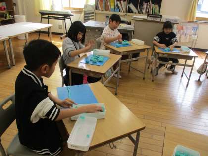 「おもいでをかたちに」という学習で、楽しかったことや頑張ったことを粘土で表す制作活動に取り組んでいます。旅行したこと、友達とプールに入ったこと等、それぞれ決めて楽しく活動しています。