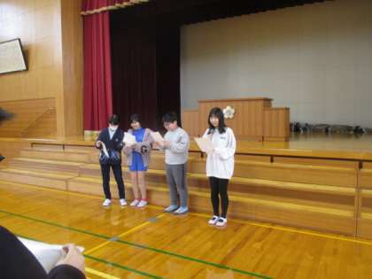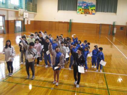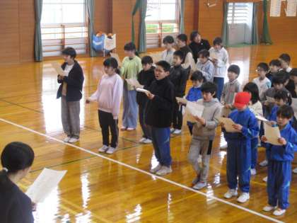 富山市ファミリーパークの開園40周年をお祝いする替え歌を全校児童で歌いました。歌チームから歌詞を教えてもらった子供たちは、「おめでとう」「ありがとう」の気持ちを込めて元気よく歌いました。撮影した動画をファミリーパークの方々に観ていただく予定です。