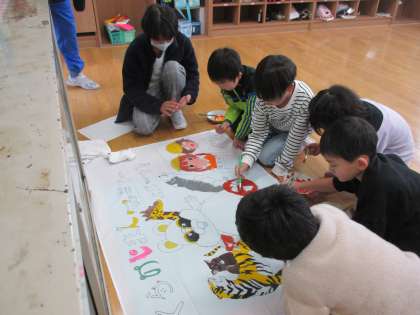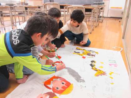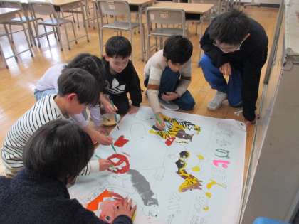 お祝いの旗作成プロジェクトチームの上級生に教えてもらって、1年生が「里ノ助」の部分の色塗りをしました。みんなのお祝いの気持ちがこもった旗になりそうです。