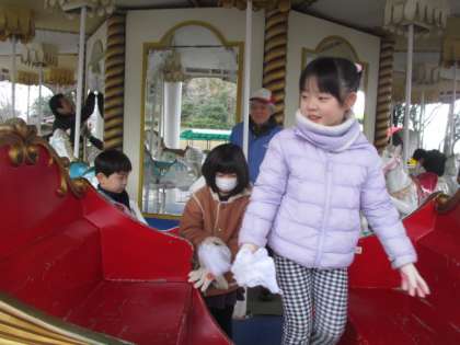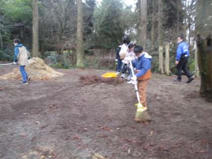 駐車場のゴミ拾いをしたり、森の冒険エリアの杉葉集めをしたり、メリーゴーランドの馬や馬車、自然体験センター内のテーブルや椅子をぞうきんできれいに拭いたりしました。