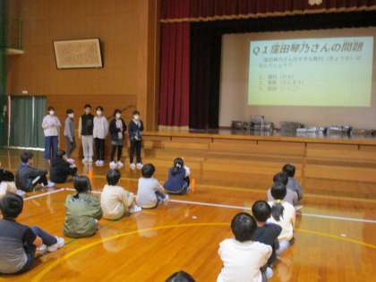 6年生は、先日の卒業を祝う集会や日頃からの感謝の気持ちをこめて、在校生ありがとう集会を開きました。6年生に関するクイズをしたり、ライブ演奏で感謝の気持ちを伝えたりするなど、思い出に残る集会になりました。