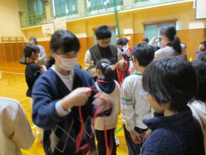集会の最後は、6年生が作ったメダルを感謝の気持ちを伝えながら在校生に渡しました。在校生も6年生も全校みんなに笑顔の輪が広がりました。