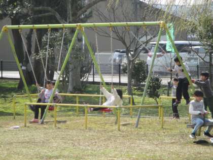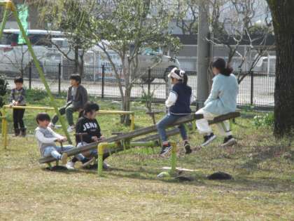 風が強いですが、久しぶりの晴れです。昼休みには、ポカポカ陽気に誘われて、グラウンドで鬼ごっこやブランコ、シーソーを楽しむ子供たちです。