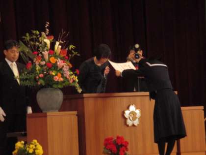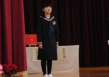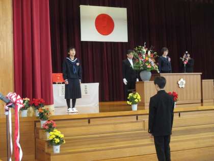 卒業証書授与です。凛とした姿で自分の思いを伝えています。証書授与の態度も立派です。