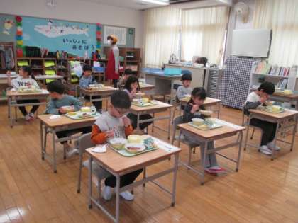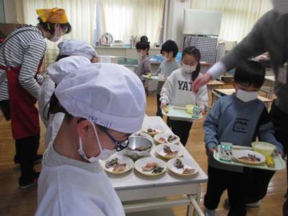 自分の給食を準備して「いただきます」。最初の一口を食べた瞬間、「おいしい」と声があがっていました。