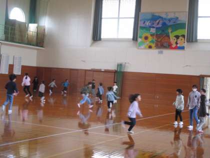 今日は雨が降っているので、昼休みを体育館で過ごす子供たちが多くいました。上級生と下級生が一緒に鬼ごっこやボール遊びを楽しんでいました。