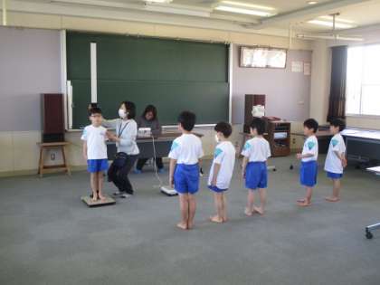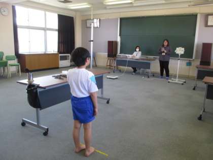 1年生の発育測定・視力測定の様子です。先生の話をよく聞いている姿が立派でした。