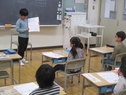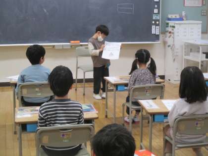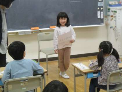 1年生は、自分の名前の文字を使って自己紹介をしています。一人一人が大好きな物、得意な物がよく伝わってきました。