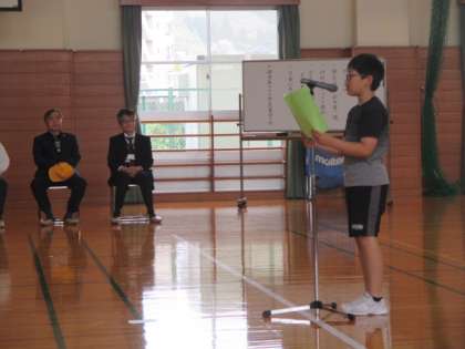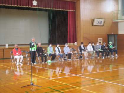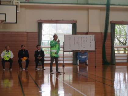 見守り隊隊長、スクールガードリーダーの方々を始め、安全見守り隊の皆さんが学校に来てくださり、今年度の安全見守り隊結成式を行いました。