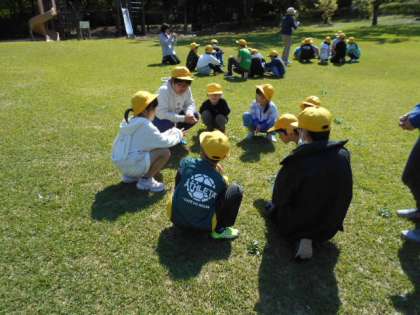 芝生広場でファミリー班ごとに自己紹介をしました。友達の好きな物を興味津々で聞いています。