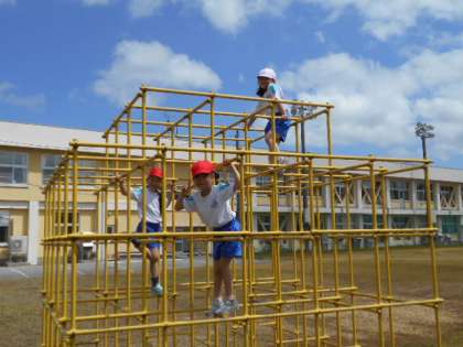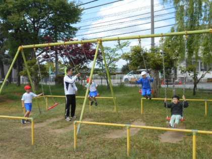 お天気がよくて気持ちのよい日です。1年生がブランコやジャングルジムで遊んでいます。