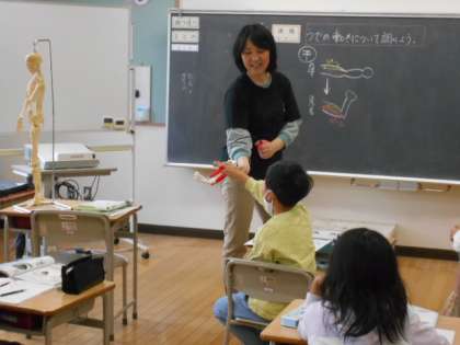 腕を曲げたり伸ばしたりしたときの筋肉の様子を自分の腕や模型で確かめています。