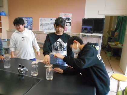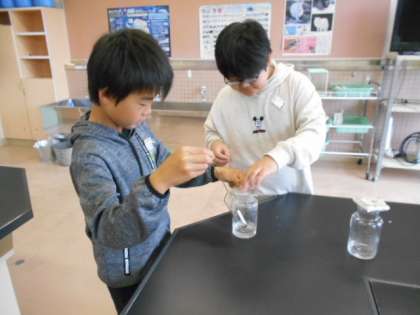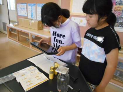 ろうそくが燃える前と燃えた後の空気を気体検知管と石灰水を使って調べています。方法を自分たちで確かめながら実験を進めています。