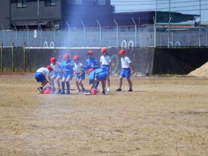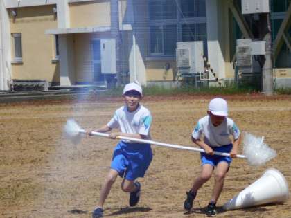 台風の目の練習をしています。コーンの回り方や全員の足下に棒をスムーズに通す方法を考えながら練習しています。