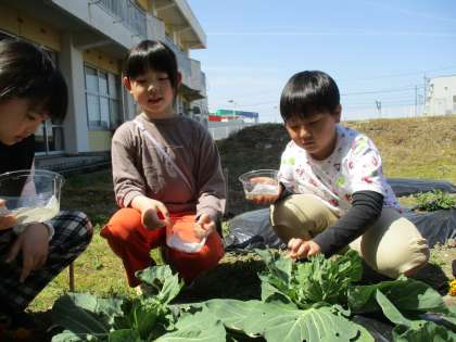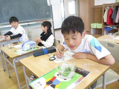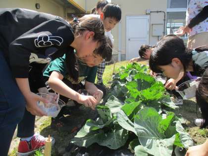 3年生 アオムシとの出会い 公開日 2024/05/11 更新日 2024/05/11 3年 理科の学習でモンシロチョウの成長について学習しています。キャベツ畑にいってアオムシを見つけたあと、虫めがねを使ってくわしく観察しました。これから大切に育てて、成長を見守っていきます。