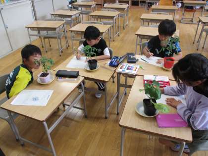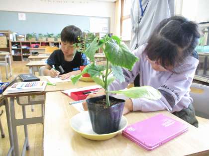 自分が選んだ野菜の苗を観察しました。「ミニトマトの葉は、ギザギザだね」「キュウリの葉は大きいね」発見がいっぱいです。