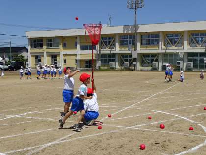 次に、みんなで一斉にかごをめがけて、空高く玉を投げ入れます。赤団の様子です。