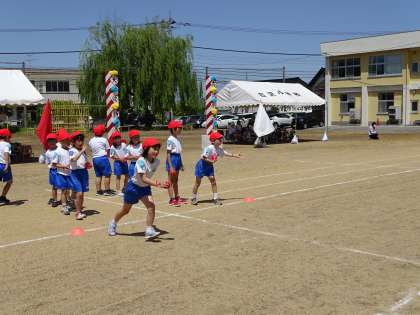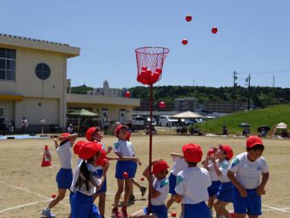 まずは、玉入れリレーです。なるべく速く、でも落ち着いて玉を投げることが大切です。