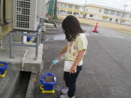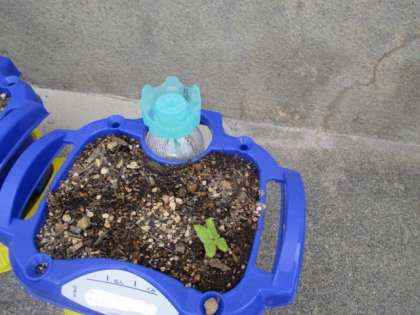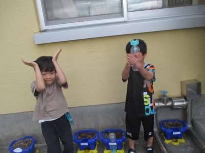 「アサガオの芽が出た」「今日、芽が出ると思っていたよ」と弾んだ声で教えてくれました。葉と葉がくっついた様子もジェスチャーで教えてくれました。