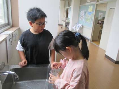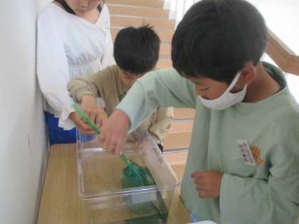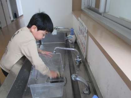 大休憩に3・4年生がホクリクサンショウウオのお世話をしています。水槽を洗ったり、エサの赤虫を用意したり、グループの役割分担もバッチリです。