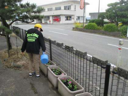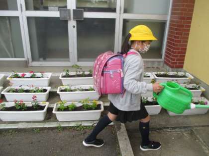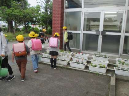 昨日ファミリー班ごとに植えたプランターの花に水をやる子供たちの姿が見られました。