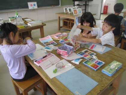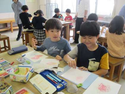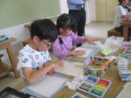 1年生は初めてのパステル画に挑戦です。パステルを粉にして指で塗る感触を楽しんでいます。