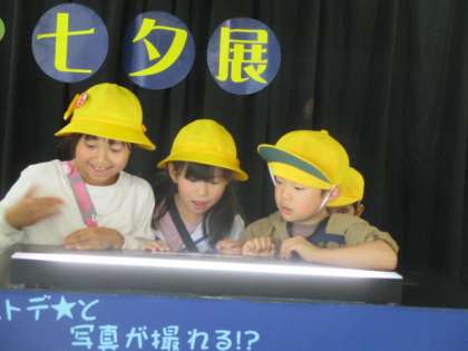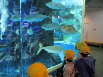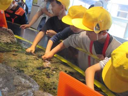 グループごとに魚津水族館を見学しました。富山湾に住む魚たち、深海魚等、子供たちは水槽に顔を近付けて興味津々で観察したり、海の生き物と直接触れ合うことを楽しんだりしながら、生き生きと活動していました。