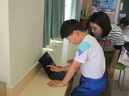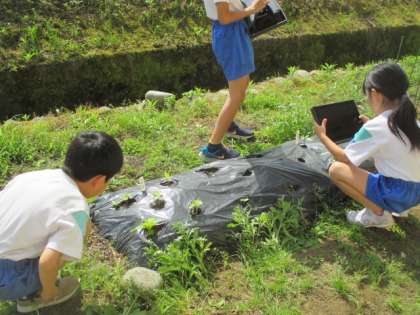 植物の芽をクロムブックで撮影したり、実際によく見たりして観察しています。植物によって葉の形に違いがあることに気付いていました。