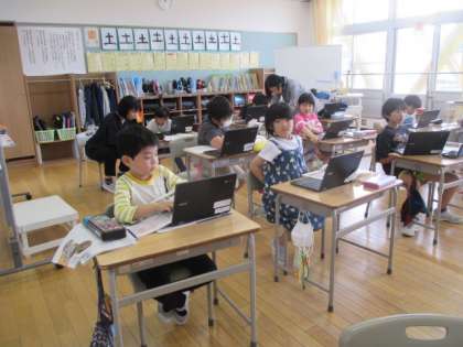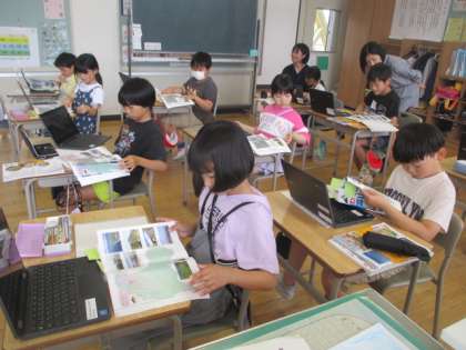 富山市の様子で発見したことや気付いたことをクロームブックで共有しながら発表しています。