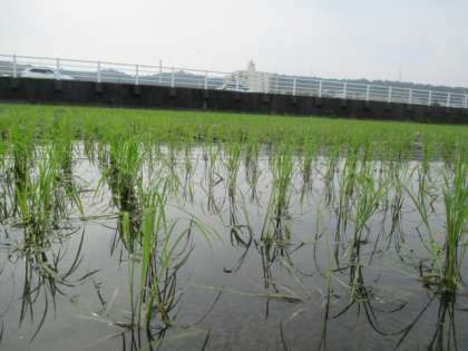 5月21日に5・6年生が地域の方と植えたモチ米の苗は15cmほどに成長して、風に揺れています。