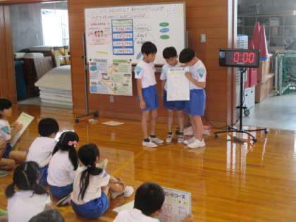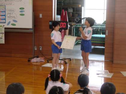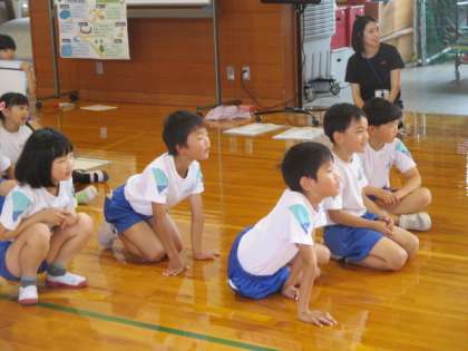 子供たちは、友達のコースのよさを感じたり、動きの工夫を見つけたりしながら聴いていました。