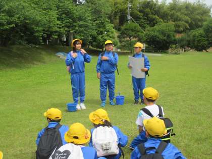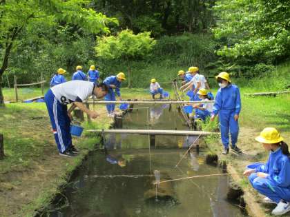 一番始めの活動は、ザリガニ釣りです。今回は古沢のオリジナルルールで、班ごとにザリガニの数と大きさを競い合いました。たくさんのザリガニを釣ることができ、大きな歓声が上がっていました。