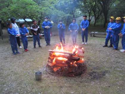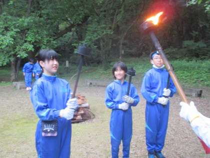 大きな火を囲み、キャンプファイヤーが始まりました。5年生の活動係が計画し、厳かな中にも、楽しいひとときの時間でした。火の神から、今年は、「友情」「挑戦」「本気」の火を授けてもらいました。